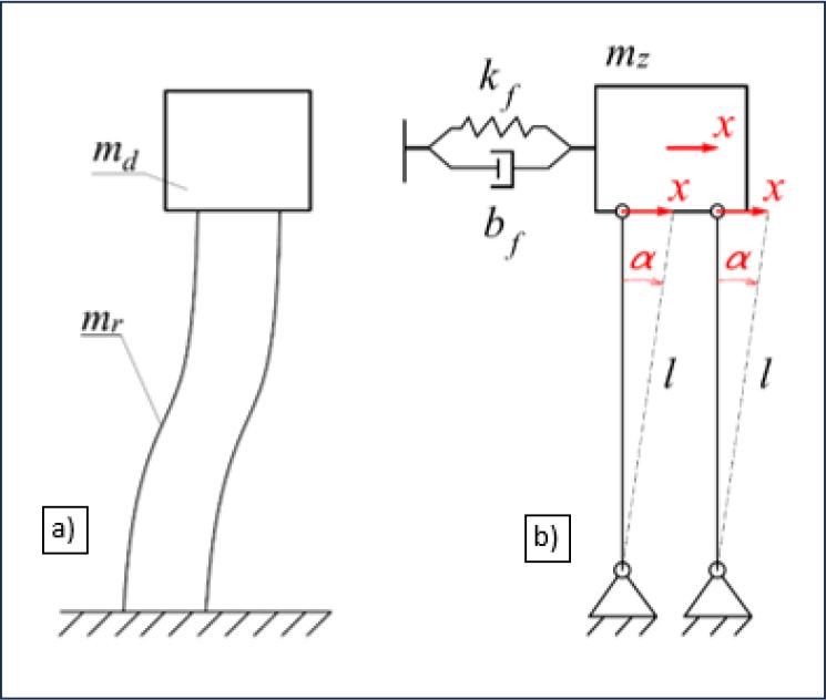 Continuous model of the tested system showing the first natural frequency (a), discrete equivalent model of the tested system for the first natural frequency (b)