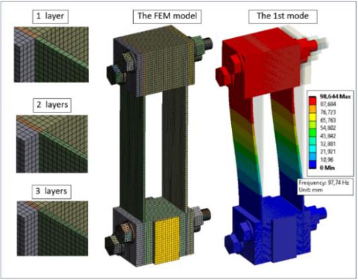 The difference between the results (Tab. 5.) obtained for models with 3 and 2 layers was approximately 0.06%, indicating the high accuracy of the results. These results are in good agreement with the result of the formula (49) taking into account the mass of the spring (97.33 Hz). The difference between the pattern result and the 3-layer FEM result was approximately 0.4%.