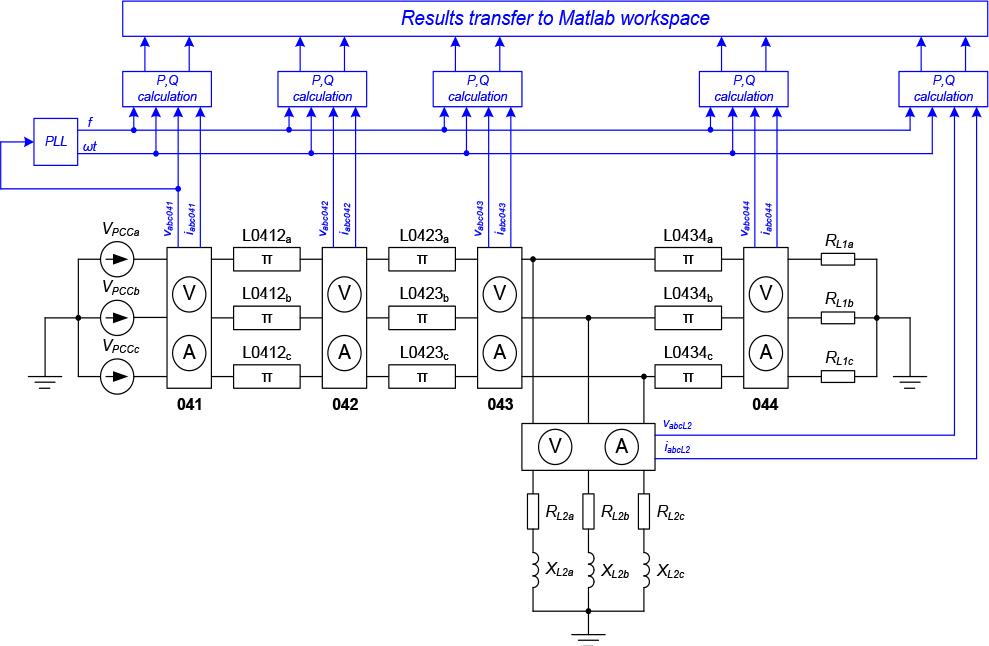 The model itself operates in three-phase structure, however proper calculations execution demanded the use of values for balanced system. Thus, all blocks parameters were symmetrized according to (4):