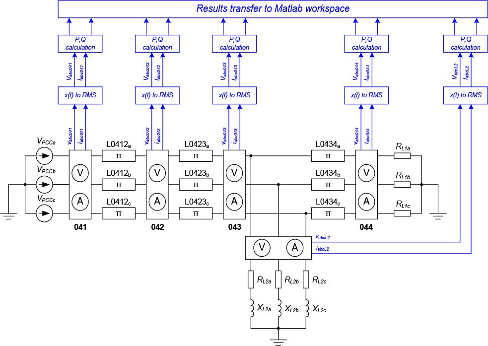 The accuracy of meters included in the simulator is stated as ±0,2% ± 1 digit for both voltage and current measurement, so re-sults obtained from it can be considered as faithful for comparison. However, meters used for measurements within the simulator are by default scaled in kilowatts and kilovars, what makes power measurement not as straightforward for lower values ranges. As this is not an issue for the analysis representing typical grid opera-tion, it might have influenced the values obtained during measure-ments conducted for purpose of different grid elements parametrization, especially when operating in no-load and lower loading con-ditions.