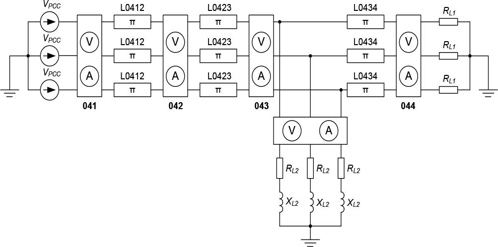 Chosen type of power line model is representative for overhead lines of rated voltage above 30 kV or cable lines of voltage ranges above at least 1 kV. The model includes line susceptances, as shown in Fig. 2. Total susceptance value for a whole line is divided by 2 and placed as two different susceptances situated at the beginning and ending of the line. Such solution provides sufficient accuracy and excludes more complicated analyses demanding the use of distributed parameters. The test grid supplies two three phase loads located in two farthest terminals. Load located in 043 terminal is a RL-type load, while device situated in 044 terminal is a set of light bulbs, so a R-type load.