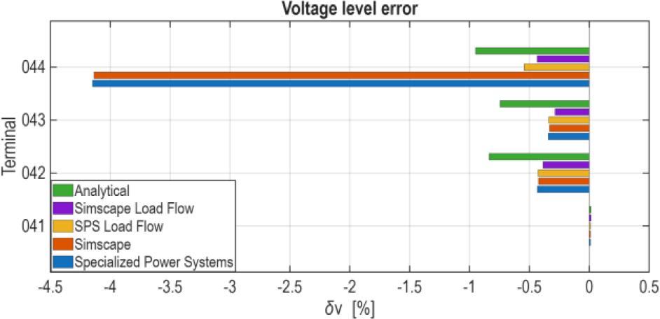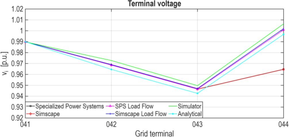Presented voltage level errors are complementary with the results illustrated in Fig. 8. The highest noted errors were slightly above 4% and noted for terminal 044 for SPS and Simscape basic models. Those were the cases, where the voltage at the end of the grid differed from other results. In all other cases noted errors did not exceed 1% what indicates that models properly map the hardware simulator grid.