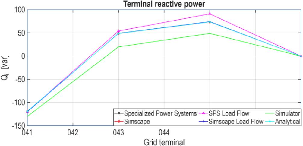 Active power was the parameter to have the greatest error in all used methods. The least error was noted for Simscape Load Flow model, and the highest for basic Simscape model. However, the difference between these two values is not as high, reaching slightly above 2% of average value. Such high errors noted for active power might be caused by previously mentioned factors including resistance changes along the grid deriving from thermal effects occurring during simulator constant operation.