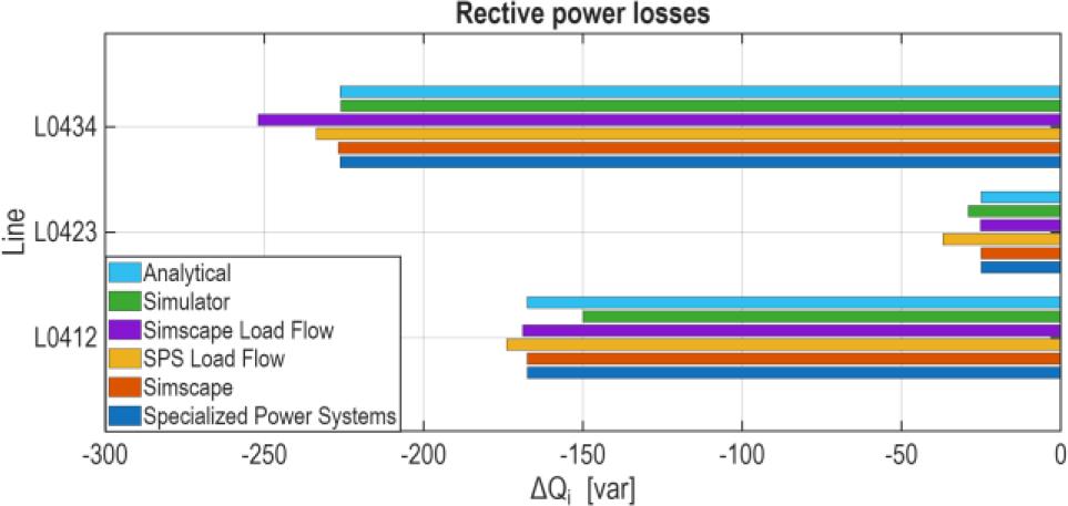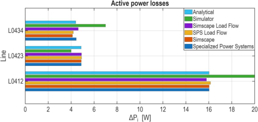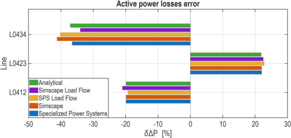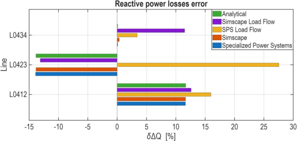 Results indicate that lowest errors values were noted for line L0412 and the highest for line L0434. This is a consequence of situation observed in Fig. 11, where active power losses in L0434 were significantly higher in the simulator comparing to computer models. The highest noted error value occurred for Simscape basic model, whereas the lowest error value occurred for Simscape Load Flow model.