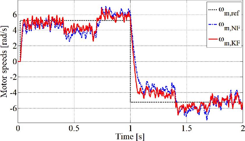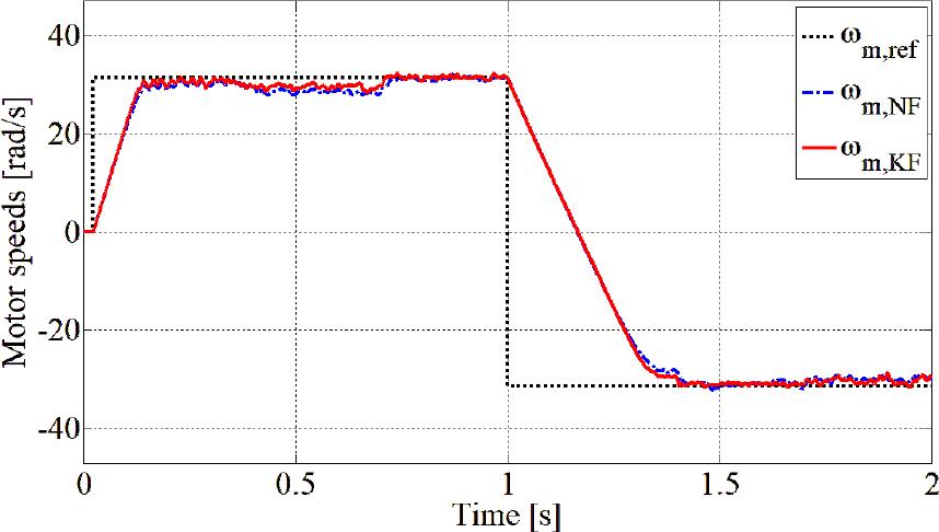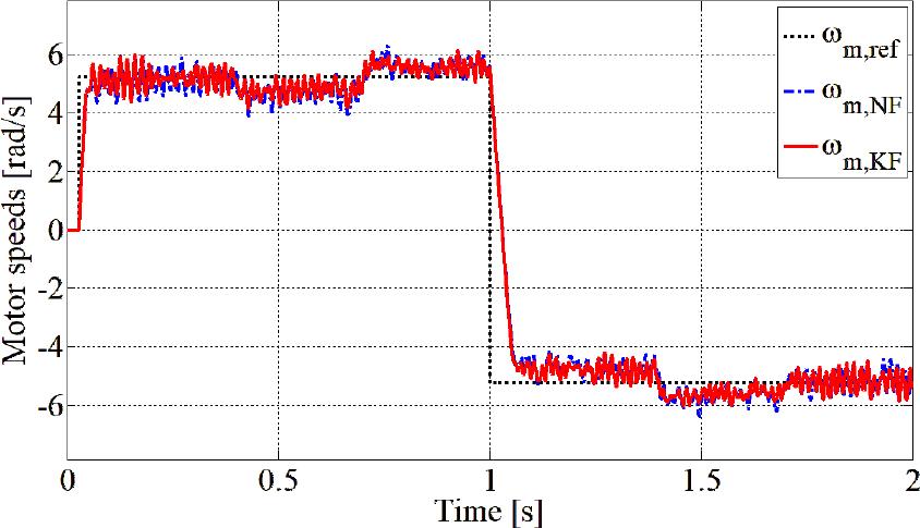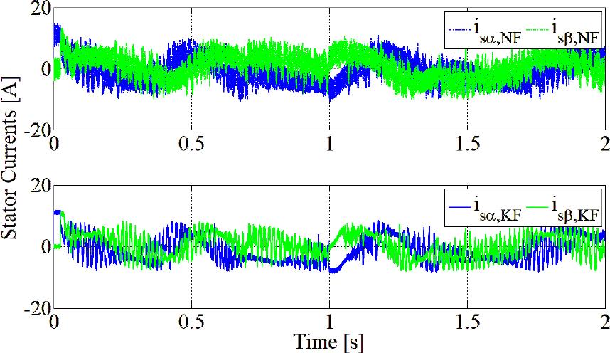 Various industrial applications such as health monitoring, robotics, sensorless control, generation systems were analysed briefly [20]. The KF increased GPS accuracy and reduced magnetometer measurement noise for estimation of position and orientation [21]. Stator currents and their derivatives were smoothed by the KF for sensorless vector controlled IM drive using back-electromotiveforce-based MRAS [22]. The extended KF (EKF) provided estimated feedback signal for suspension control system with spiral springs and magnetorheological dampers [23]. Rotor speed, rotor position and machine parameters of the SRM were estimated by the KF [24]. Speed and rotor flux were computed by the EKF that approximated covariance matrices of noise process and measurement vectors using genetic algorithm [25]. Noise covariance matrices were also adapted for sensorless drive using the EKF that integrated the maximum likelihood criterion and weighting algorithm [26]. An ANN-based observer was trained by the KF to improve the speed response [27]. The EKF was combined with intelligent magnetic model for SRM drive [28]. An iterated EKF that used two IM models was utilized to obtain estimations of IM resistances and speed [29]. The current noise was compensated by the EKF to improve the performance of sensorless PMSM drive using the MRAS [30]. Discretization methods were analyzed and selected for increasing precision of the flux and speed estimations for induction generator [31]. The extended KF that used the suboptimal principle enhanced the robustness in combination with the MRAS for sensorless bearingless IM control [32]. Next section, in order to reduce influence of Gaussian noises of stator currents on sensorless PWM-DTC IM drive using the RF-MRAS and simultaneously improve its estimation accuracy at medium and low speed areas [8], [16], the EKF that utilizes the IM model to obtain smoothed stator currents is presented. The filtered currents are employed for computations of both estimated speed and important quantities of the DTC. The third section is simulations and discussions. Conclusions are carried out in final section.