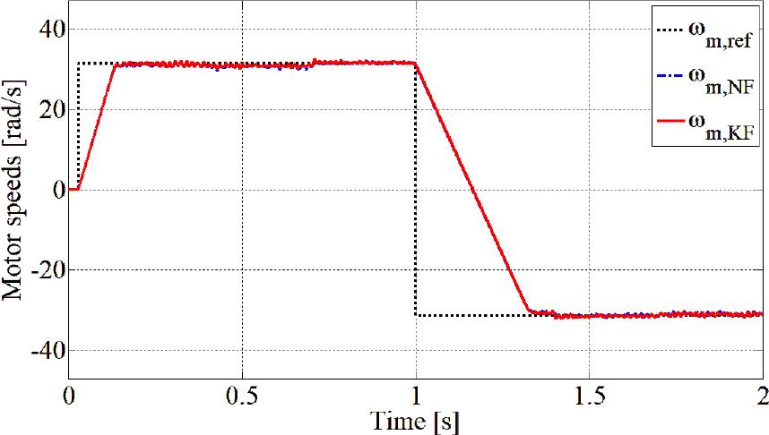Figures 2–4, 5–7 respectively show motor speed responses in cases of δp2 = δm2 at ωm,ref = 5π/3 rad/s, ωm,ref = 10π rad/s. The figures indicate that as the variance increases, the performance of the speed response is improved more. Tables 2 and 3 list the ITAEn at ωm,ref = 5π/3 rad/s and ωm,ref = 10π rad/s in all cases of variances. The tables show that the ratio (ITAEn,KF/ITAEn,NF) is smallest when the ratio (δm2/δp2) is largest, and vice versa (see Figs. 8–9). The ratios (ITAEn,KF/ITAEn,NF) are in ranges of [24.2%; 98.9%], [24.6%; 99.0%] for ωm,ref = 5π/3 rad/s, ωm,ref = 10π rad/s, respectively.