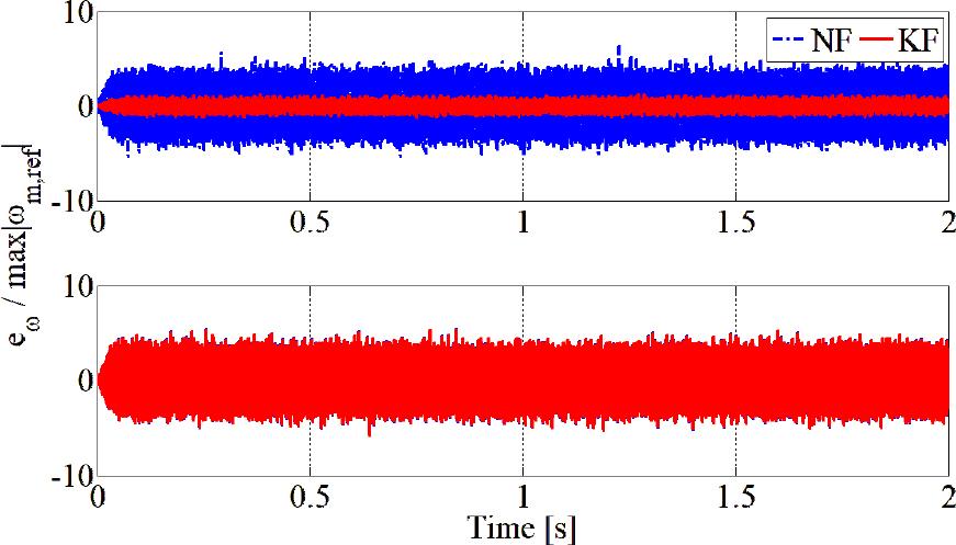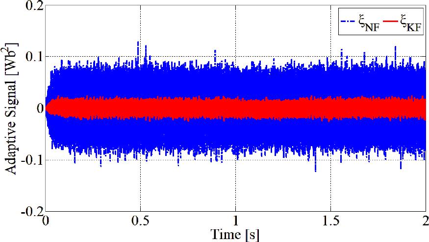 Time courses of relative speed difference RSD (eωmax| ωm,ref|) for cases of the ratio (ITAEn,KF/ITAEn,NF) reach maximum & minimum at ωm,ref = 5π/3 rad/s and ωm,ref = 10π rad/s are respectively shown in Figs. 10 and 11. Diagrams of stator currents are displayed in Figs. 12–13 and 14–15 for ωm,ref = 5π/3 rad/s and ωm,ref = 10π rad/s, respectively. The reason why the proposed EKF-based MRAS speed estimator is more efficient in the cases of larger ratio (δm2/δp2), is because the matrix R is assumed to be known. The covariance matrices Q and R can be estimated according to the methods in [25]–[26]. Quantities including stator fluxes, rotor fluxes of reference model, rotor fluxes of adaptive model, and adaptive signal at ωm,ref = 5π/3 rad/s & ωm,ref = 10π rad/s, δp2=0.12, δm2=12 are respectively presented in Figs. 16–17, 18–19, 20–21, and 22–23. Figures 22–23 indicate that ripple of the adaptive signal for the KF is much smaller than that for the NF. This results in significantly lower RSD for the KF. Tables 4–5 show maximum value of absolute of relative speed difference (MARSD) at ωm,ref = 5π/3 rad/s & ωm,ref = 10π rad/s for all variances. The MARSD is reduced by 80% and 77% at most, corresponding to δp2=0.12, δm2=12, for ωm,ref = 5π/3 rad/s and ωm,ref = 10π rad/s, respectively.
