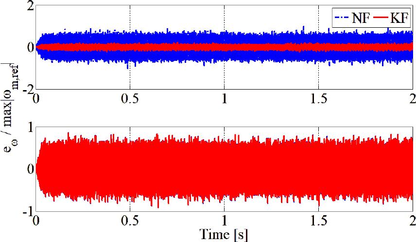 Parameters of the IM are given in Table 1. Simulations of two sensorless RF-MRAS-based DTC IM drives: the first one is without extended Kalman filtering and the second one is with extended Kalman filtering (abbreviated as NK and KF in the rest of the text), are implemented at variances of Gaussian system and measurement noises of stator currents δp2 = {0.12, 0.52, 1.02} and δm2 = {0.12, 0.52, 1.02}. Proportional gains and integral time constants of the speed, flux, torque controllers & the rotor speed estimator are {1.5, 100, 5 & 500} and {0.05s, 0.01s, 0.05s & 0.002s}. Diagram of load torque is identical to the one, and reference speed course is similar to one ωm,ref = {5π/3 rad/s, 10π rad/s} [16]. The utilized PWM technique is space vector one with switching frequency of 20kHz, inverter DC link of 540Vdc. Normalized integral of time multiply by absolute value of speed difference (ITAEn) [16] is used to assess two sensorless drives according to Eq. (37):