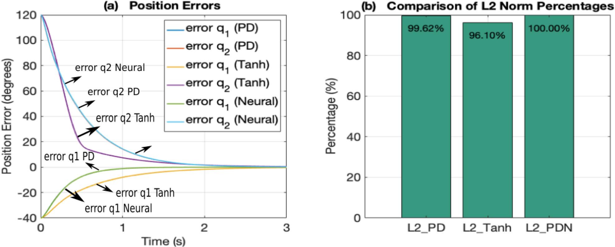 | [18] | Nonlinear PID with fuzzy self-tuned PD gains | Variable, position-dependent; fuzzy logic | Not mentioned; global asymptotic stability; no gravity compensation | Experiments; type not specified; scenario and metrics not specified |