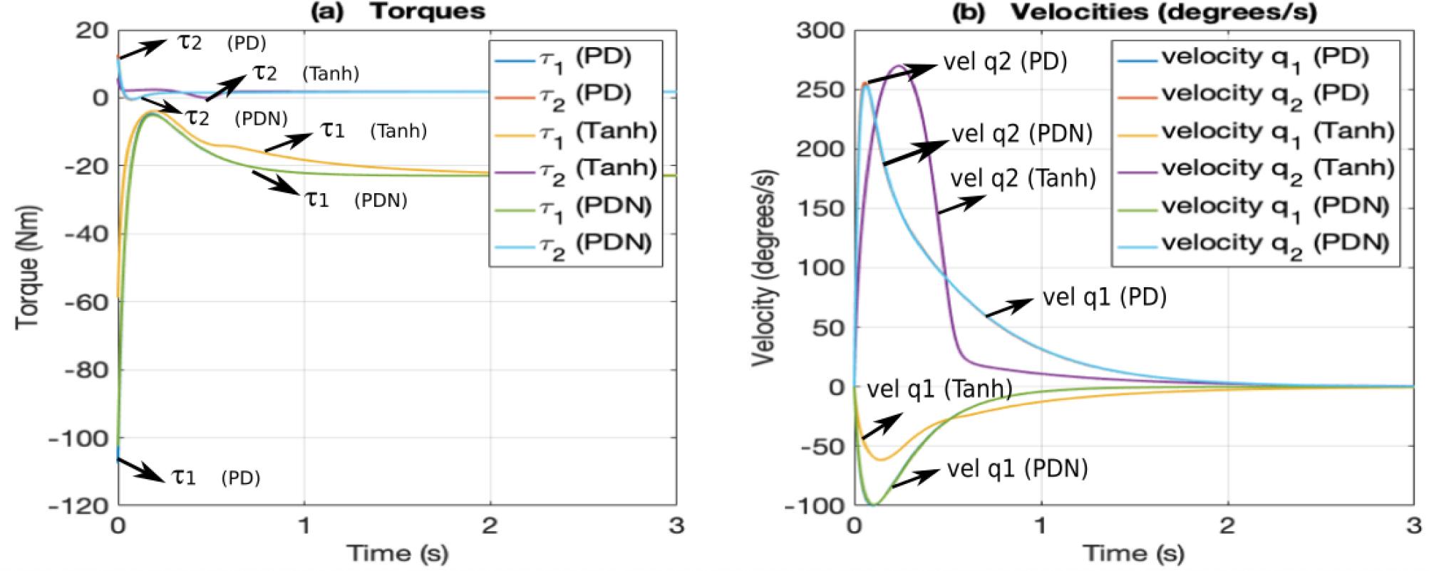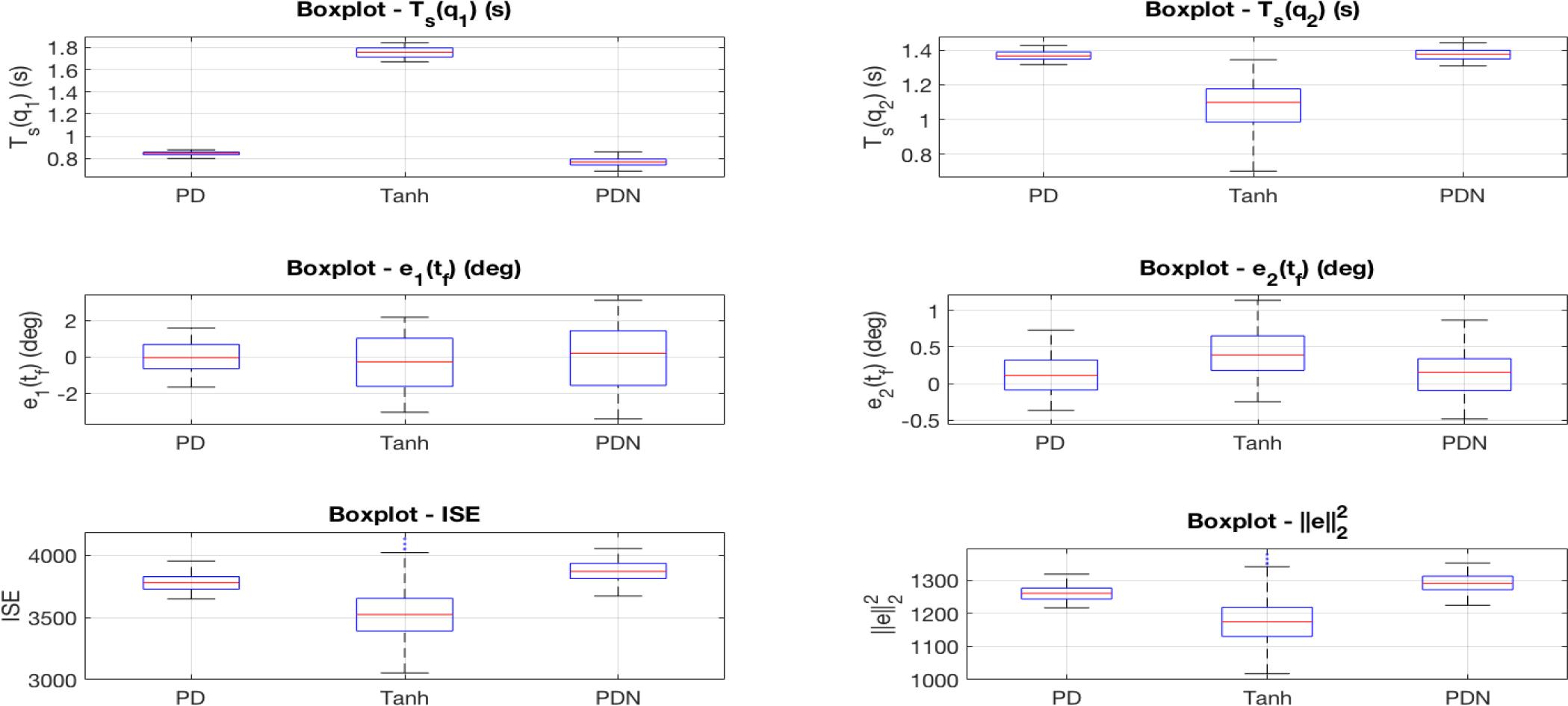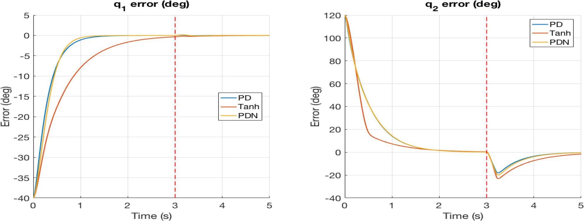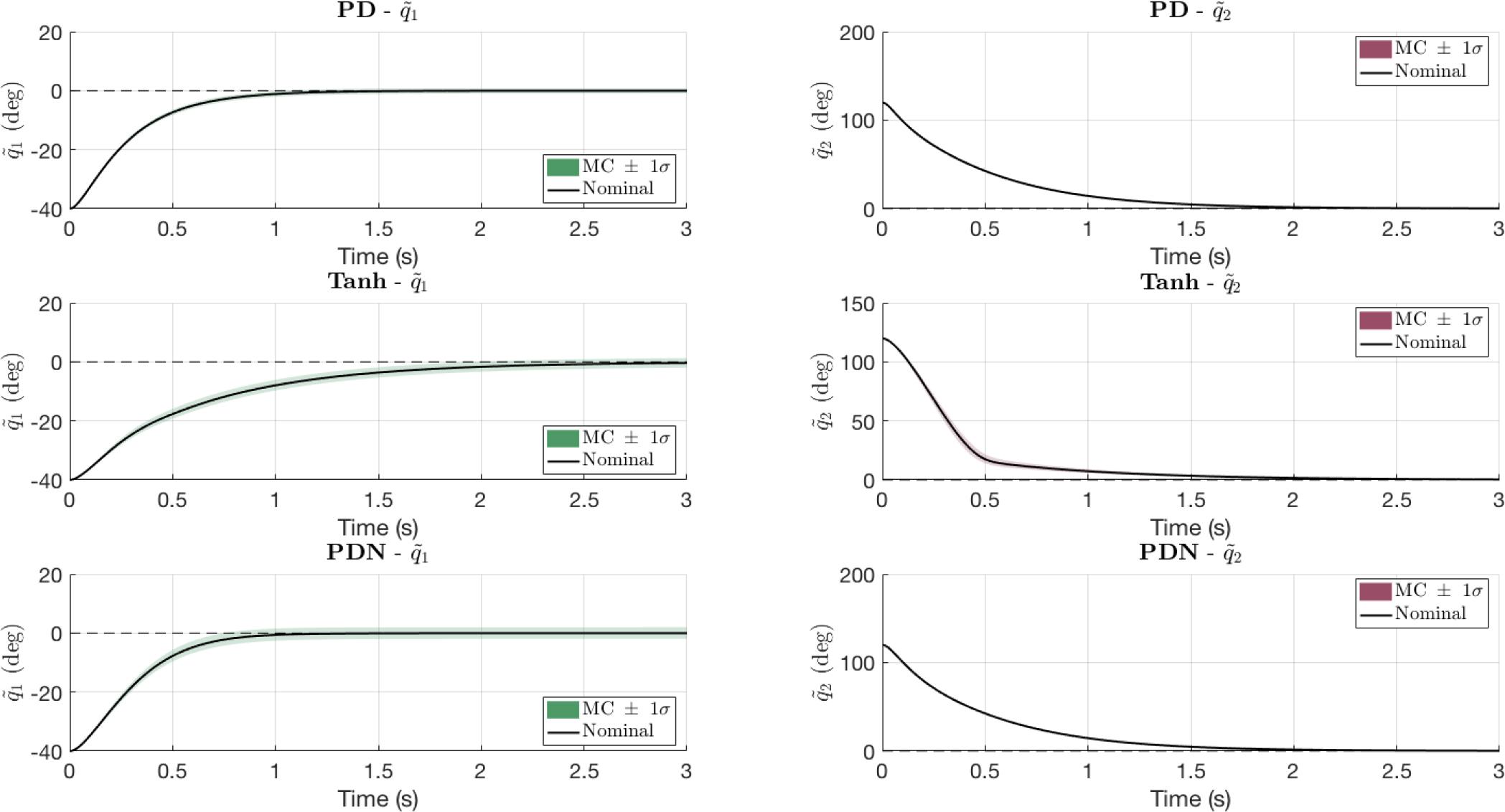 | [23] | Linear and nonlinear PD-type | Nonlinear functions of system states | Not mentioned; global asymptotic stability claimed | Simulation; single-link and two-DOF robots; trajectory tracking |