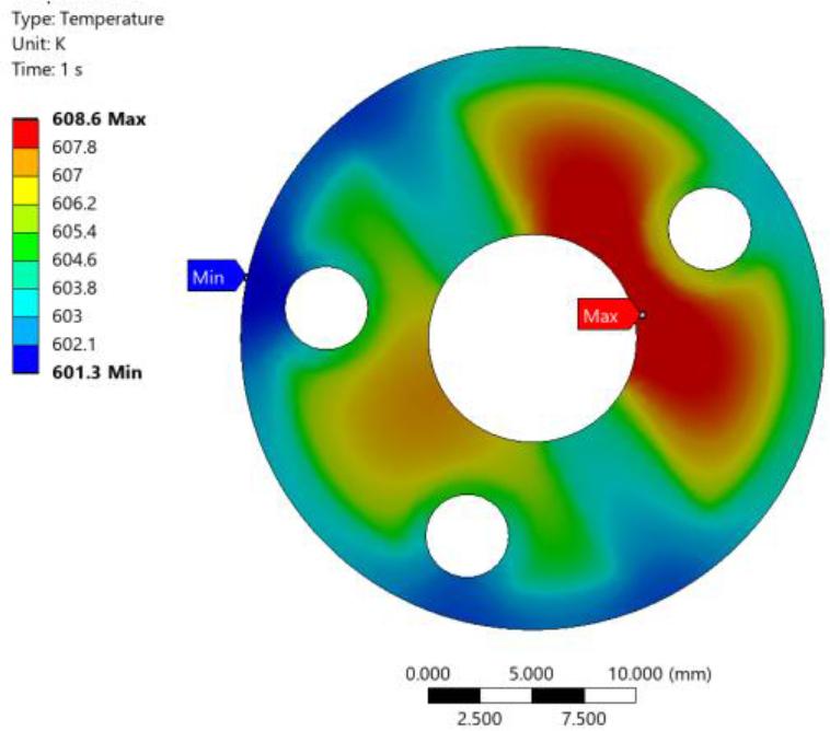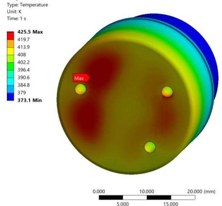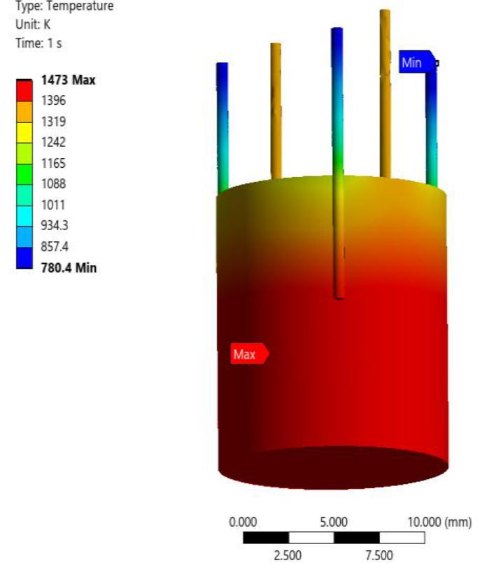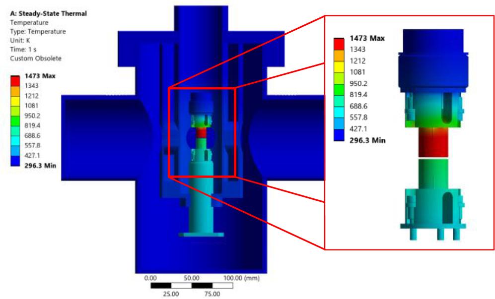 Temperature values of key converter components as a function of tungsten microheater temperature in a design with bases made of 316L steel