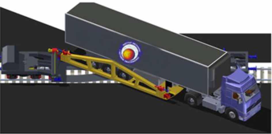 Stage II of loading – rotation of the platform, entry of the tractor with the semi-trailer, detachment and exit of the tractor itself and then re-rotation of the wagon’s loading platform to the transport position