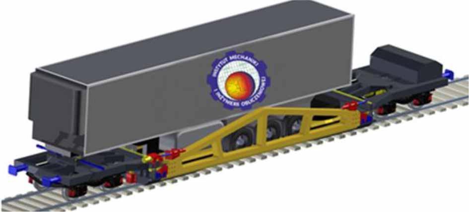 The intermodal wagon with the rotating loading platform allows for independent loading and unloading of semi-trailers without the use of additional lifting equipment and specialized platforms. The wagon design has many innovative solutions. By using special side locks and a properly shaped rotating loading platform, the effect of relieving the lowered wagon frame was achieved. Based on the conducted numerical analyses of the wagon strength and functional tests, it was found that the use of standard Y25 bogies is problematic for design, operational, production and other reasons. This translates into restrictions on the permissible speed of freight transport by railway wagons with this type of bogies [1]. The tested special wagon in the prototype version presented in Fig. 1 consists of the following parts: chassis in the form of a frame with overbogie parts and a central part profiled downwards, housing the body, i.e. the rotating loading platform. Two typical Y25 bogies with suspension stage, traction and buffer devices, other external devices and equipment, electrical equipment and hydraulic systems were mounted under the overbogie parts of the frame [1].