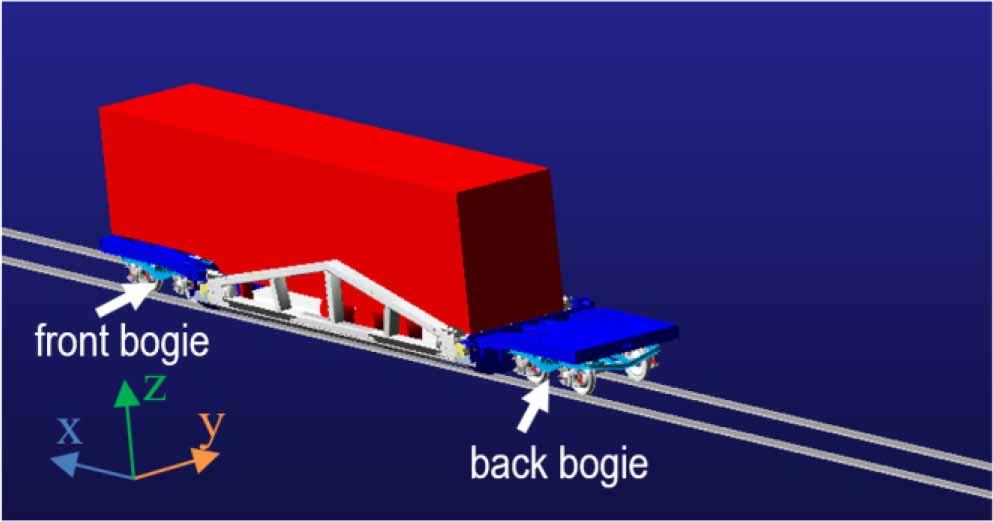 Numerical tests were carried out in professional MBS software [29]. When performing dynamic analyses with numerical methods, it is necessary to adopt certain simplifications and optimize the models in relation to the adopted assumptions. Analyzing models with all the structural details will allow to obtain accurate and reliable results, but this will come at the expense of the time it takes to build such models and increase the simulation and processing time of the results. The bogie model after such simplifications, shown in Fig. 8, does not have a braking system, wagon buffers, bogie elements necessary to install braking systems and increase the rigidity of the frame. The parts were omitted due to their low weight and the way they work, which does not affect the operation of the wagon model during simulations. Springs and friction dampers were replaced with elastic-damping elements [29], using additional translational constraints enabling vertical movement. In addition, as part of the simplification of the model, no side slides were used, which would force the definition of additional contact joints of bodies, and this would extend the simulation time and could cause problems with the convergence of the analysis. The bogie and the frame were connected by means of a typical internal constraint in the form of a spherical articulated connection [29], without the possibility of rotation relative to the X axis with respect to the global coordinate system – Fig. 9. This solution blocks the possibility of rotation of the wagon frame in relation to the bogies, as in the case of side slides. Wheel sets were defined as a set of bodies connected into one monolithic component. The bogie frame was similarly reproduced in the model. The chassis of the semi-trailer and its wheel sets were also modeled as uniform bodies. The movement of the load was limited to the possible rotation in the ZY plane in relation to the feet supporting the semi-trailer at the bottom of the loading platform – Fig. 9. To perform the analyses, it was required to enter output data such as: load, speed and friction. The UIC60 outline wheels were modeled in accordance with the standard [32] and the UIC60 rail heads were modeled as in Fig. 8.