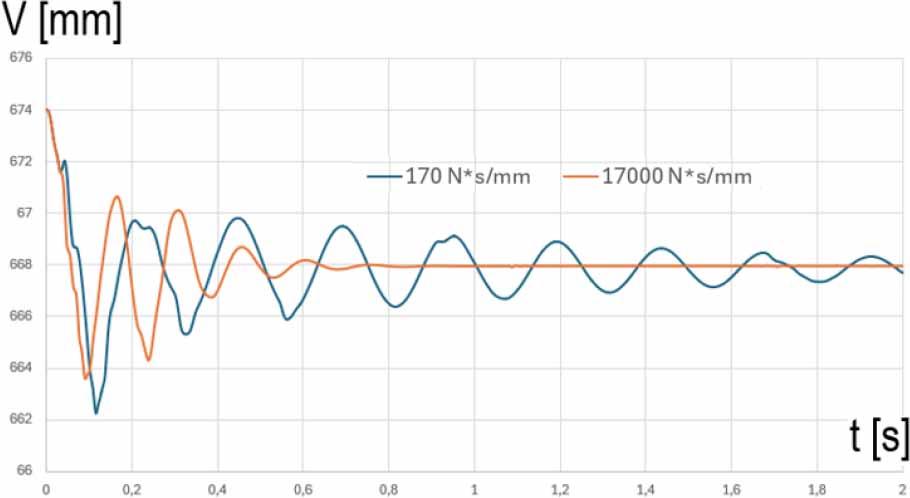 The graphs of the pressure forces of the wagon wheels on the rails, especially in the downforce phases, confirm that the values of the contact forces in the kinematic pairs decrease with the increase of damping.