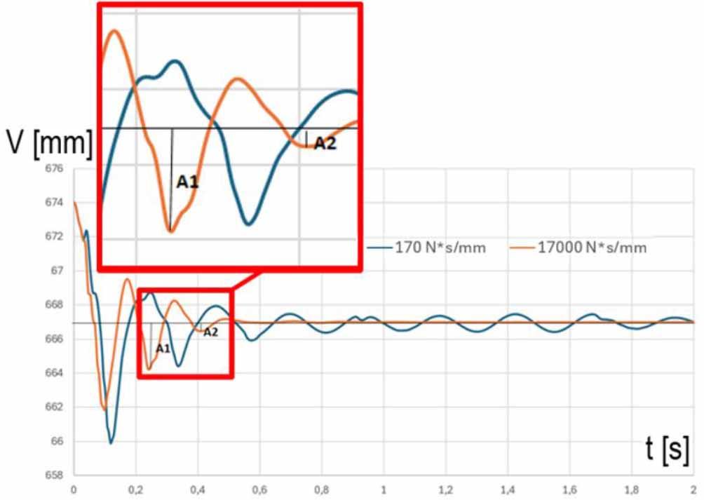 The influence of damping changes on the vibrations of the front bogie caused by the force impulse on the wagon with the semi-trailer. Graphs of vertical displacement as a function of time for two different damping values with marked amplitudes for calculating the logarithmic vibration damping decrement for suspensions with different damping variants Cmin = 170 [N·s/mm] and Cmax = 17000 [N·s/mm]