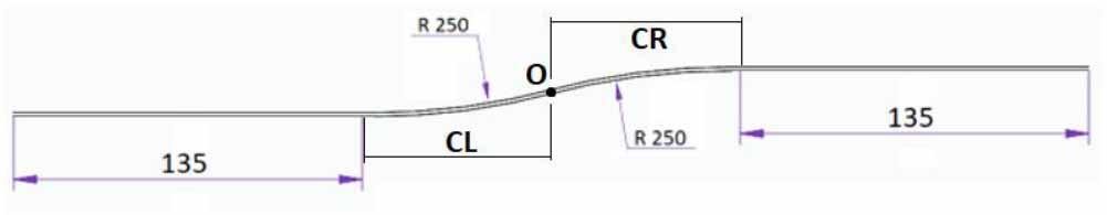 Configuration and dimensions of the curved track; CL – curvature to the left, CR – curvature to the right, O – point of inflection of the curvature/change of direction of track curvature