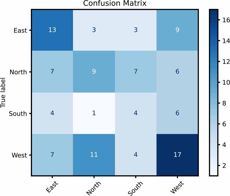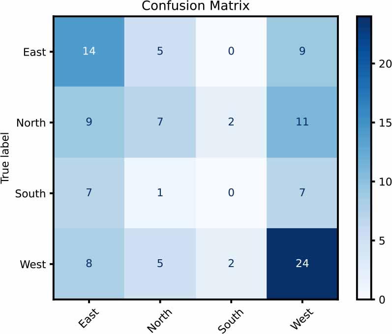 Analyzing the confusion matrix in Figure 11 demonstrates that the east and south directions were most frequently misclassified as west. In the north direction, the errors were evenly distributed among the classes. The direction of the west was most frequently misclassified as north.