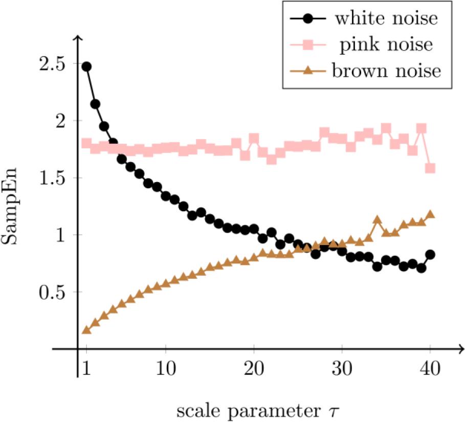 Calculations for a white noise, brown noise and pink noise are provided in Fig. 2. It can be observed that each noise has its characteristic MSE behavior. SampEn for the white noise drops when the scale parameter grows – complexity for higher time scales drops, SampEn for the pink noise is approximately constant – the same complexity for all time scales considered and SampEn for the brown noise rises – complexity also increases.