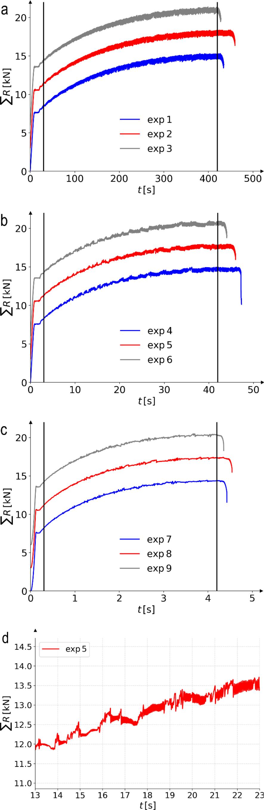 Sum of reactions vs. time for low strain rate (a), medium strain rate (b), high strain rate (c), zoomed-in view of the selected area for medium strain rate (d)