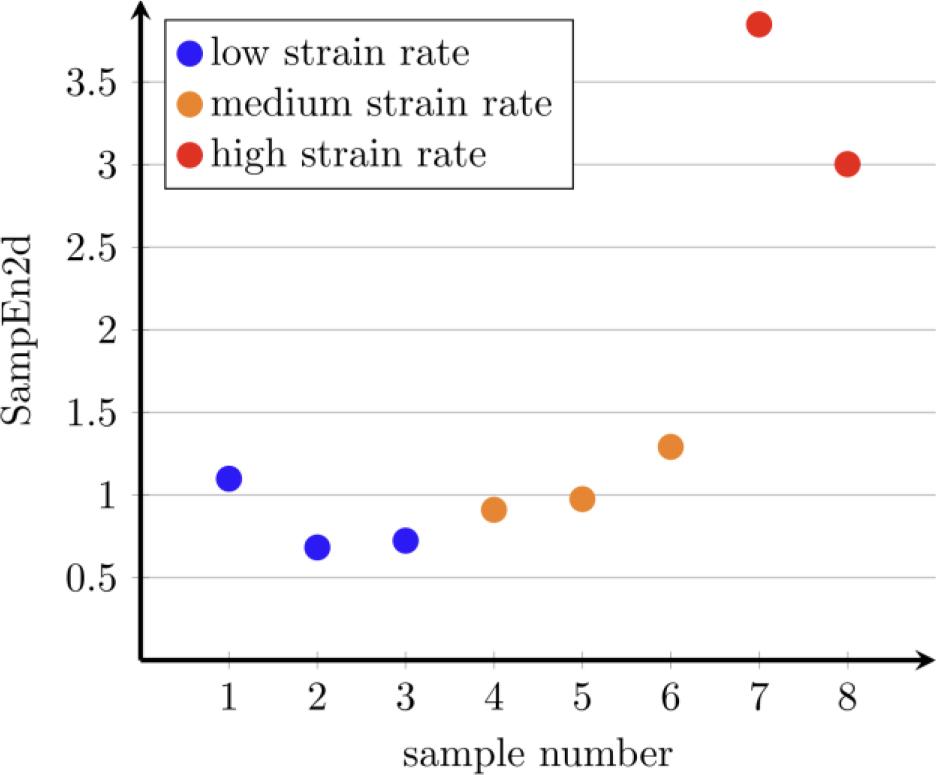 The values of Sample Entropy 2d are summarized in Tab. 7 and Fig. 5. The results for low and medium strain rates are on the same level, between 0.5 and 1.5, and for the high strain rate around 3.0-3.5. It indicates a similar tendency as for Sample Entropy. There is not enough data to calculate SampEn2d for two intervals as for SampEn.