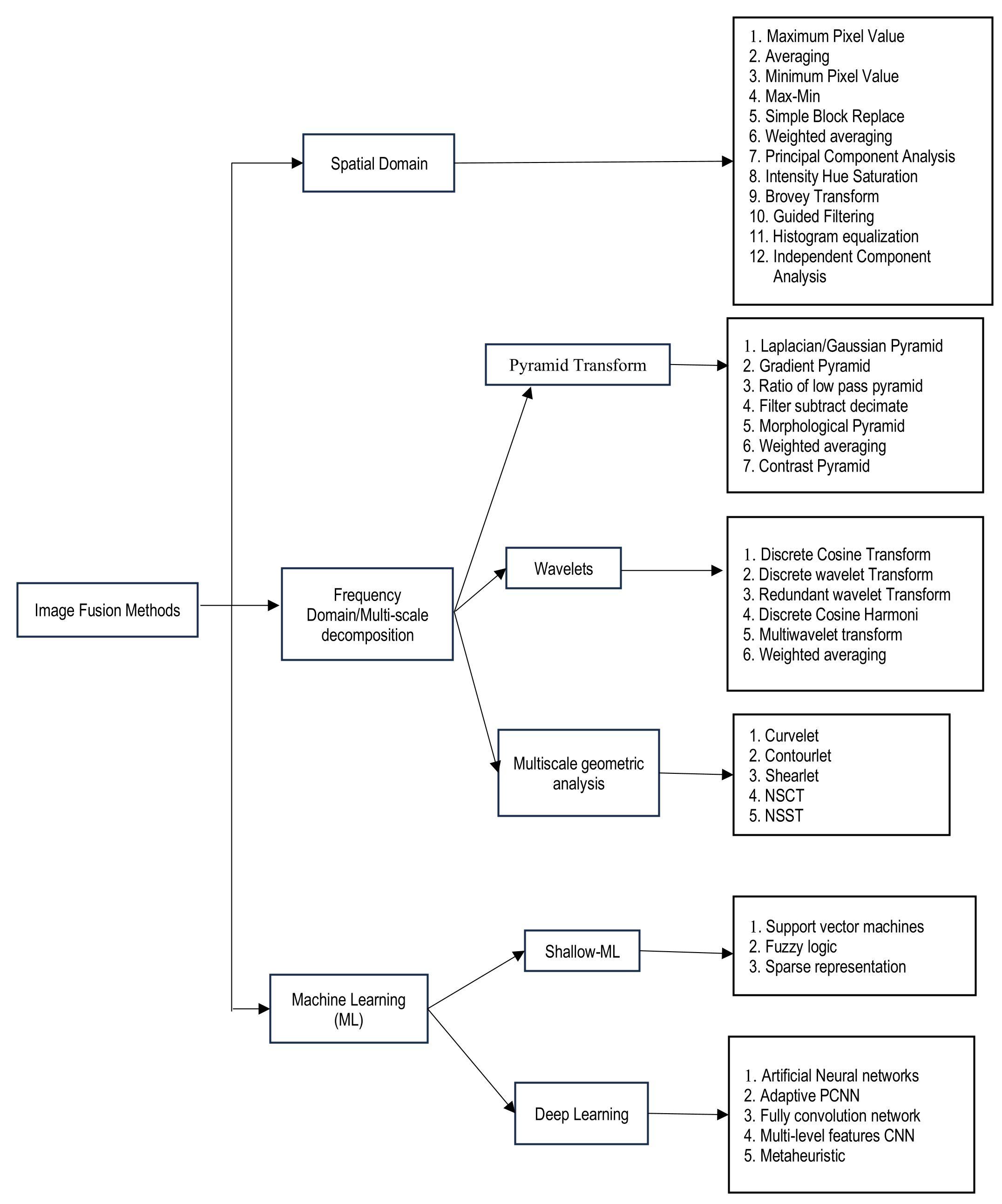 | Morphological pyramid [34] Laplacian/Gaussian pyramid [34,35] Gradient pyramid [36] Low-pass pyramid ratio [37] Filter subtract decimate [36] | Provide better image quality | The fused image is affected by the number of breakdown levels. Also, there is no direction information, so detailed image information in different directions cannot be extracted. |