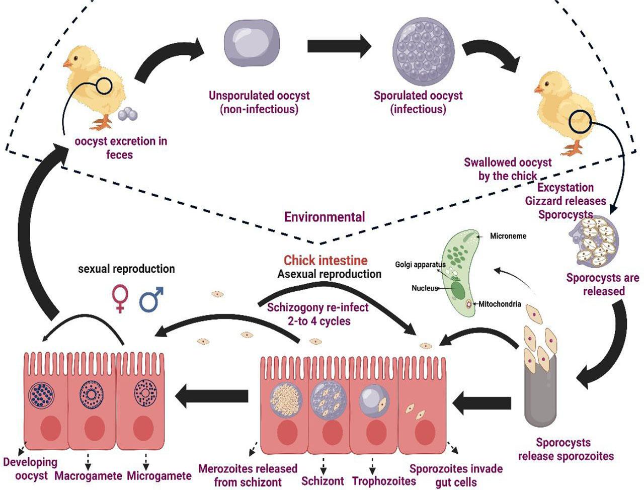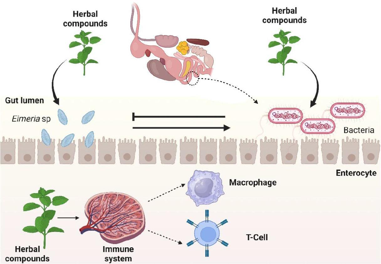 | Artemisia annua; Artemisia sieberi | Aerial parts | Artemisinin, Artemisia ketone; artemisinic acid; scopoletin, α-caryophyllene; germacrene D; Acenaphthene; 2-cyclohexen-1-one, 3-methyl-6-(1-methylethyl) | Artemisinin inhibits the growth of Eimeria sp and its sporulation. It reduces the formation of lesion score by degrading the bacterial iron-peroxide complex via the production of free radical oxygen. Coroian et al. (2022) declared that the number of oocysts per gram of feces in chickens and their lesion score decreased after treatment by Artemisia annua and Artemisia sieberi. Furthermore, it affects the gametocyte sexual cycle of Eimeria tenella via termination of the sarcoplasmic-endoplasmic reticulum calcium ATPase enzyme expression. Other components in Artemisia annua and Artemisia sieberi improve the immune response, food absorption, and digestion by increasing the beneficial intestinal microflora. | (Coroian et al., 2022; Jiao et al., 2018) |