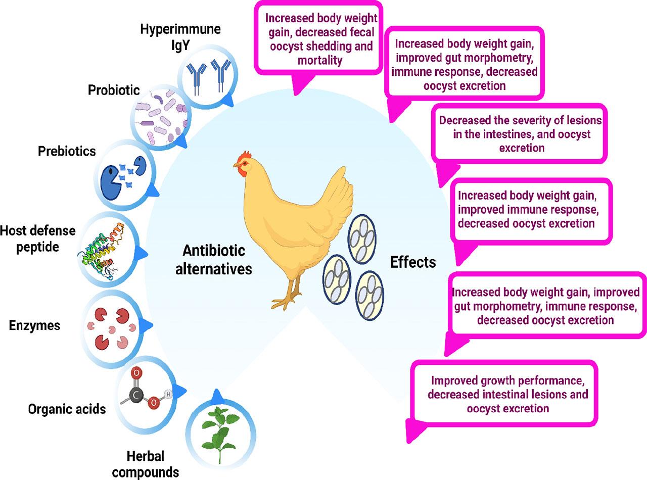 | Triticum aestivum Saccharum officinarum | Endosperm and embryo of the wheat plant, root of Saccharum officinarum | Arabinoxylans, sugar cane | Arabinoxylan inside Triticum aestivum and Saccharum officinarum have an anticoccidial effect against coccidiosis, improving body weight, oocyst shedding, and lesion score. Arabinoxylan and sugar cane improve the natural adaptive immune response inside infected chicken against Eimeria sp. | (Awais and Akhtar, 2012) |