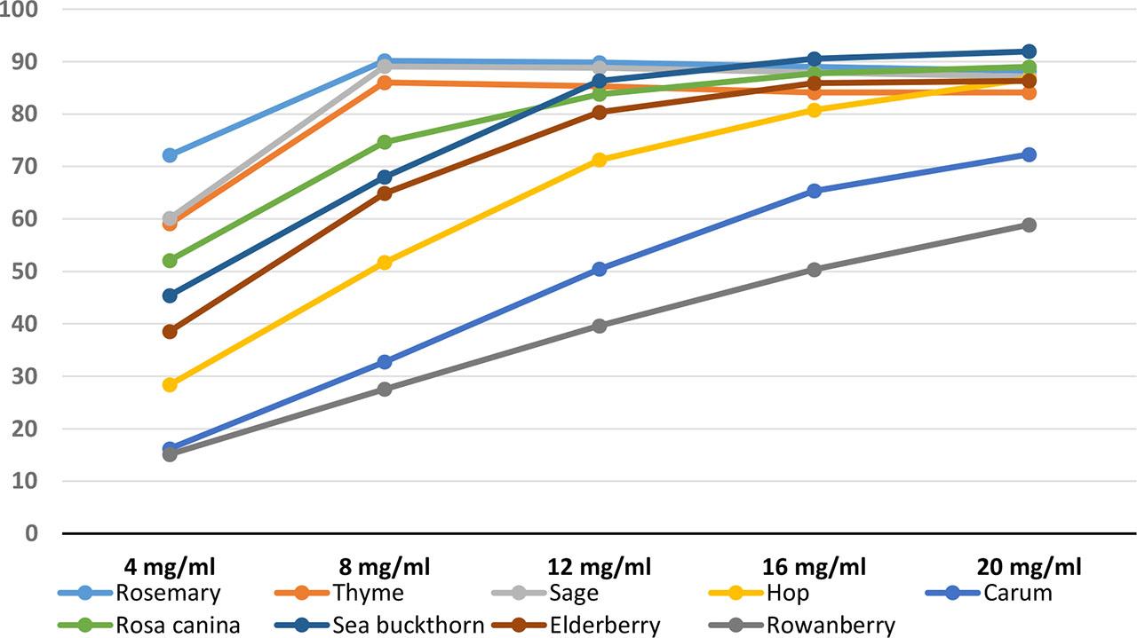 Percentage of reaction inhibition (%), i.e. the ability of the tested herbs and fruits dried raw materials to counteract the oxidation reaction with increasing sample concentration in DPPH test