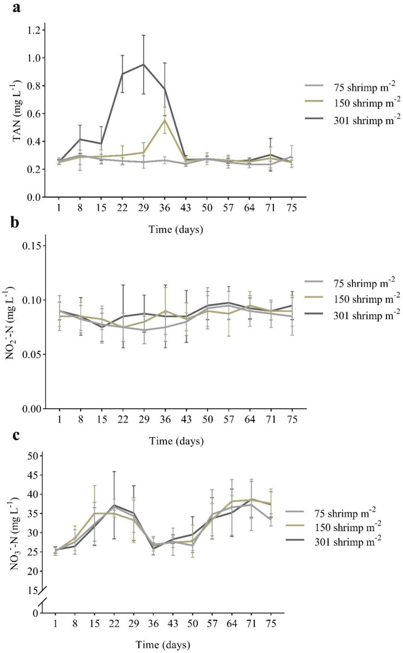 | Total ammonia nitrogen (mg L−1) | 0.26 ± 0.05b | 0.30 ± 0.09ab | 0.44 ± 0.28a |