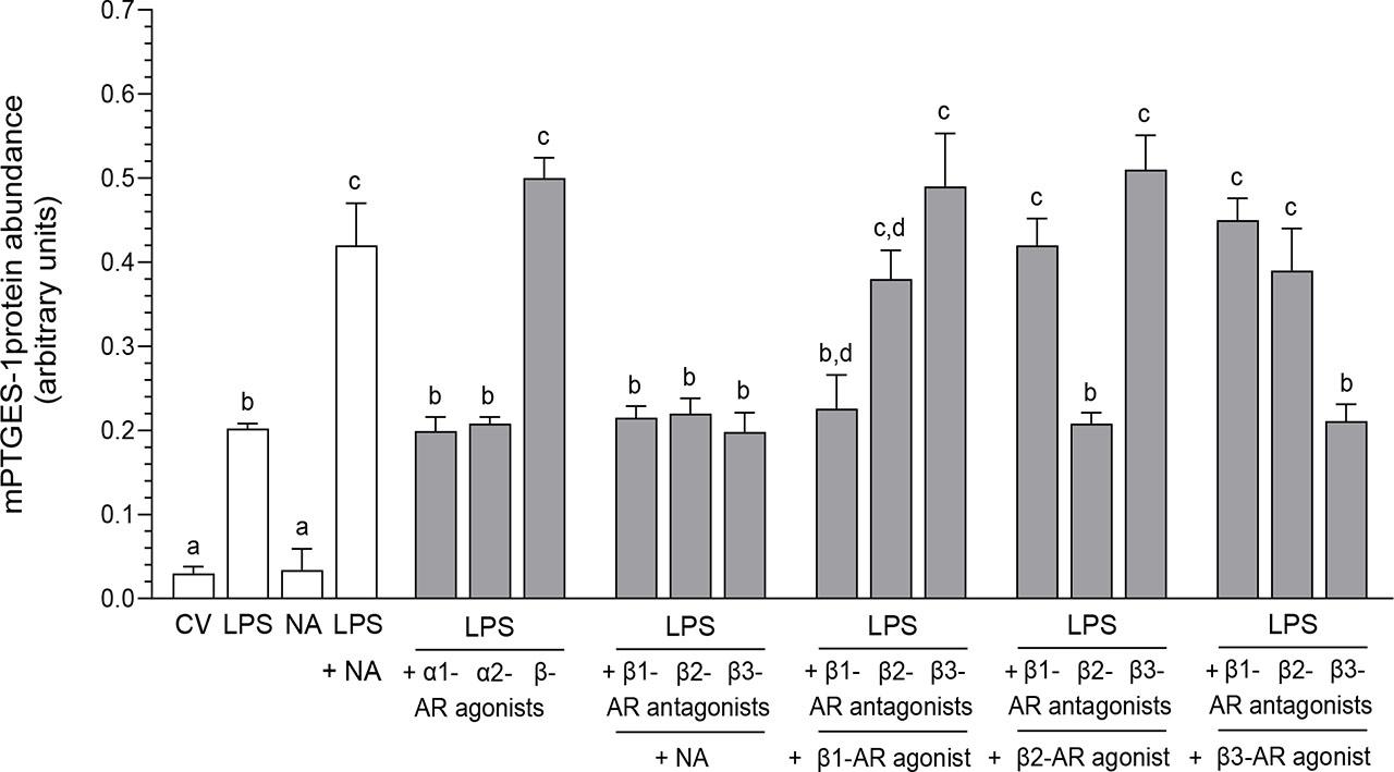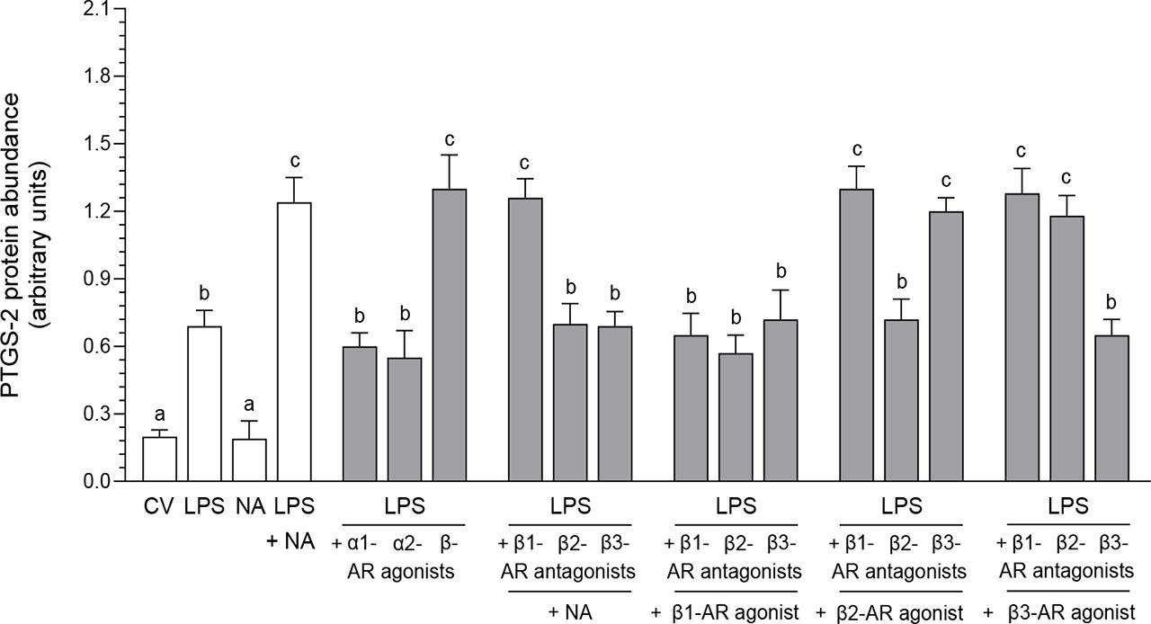 Influence of noradrenaline (NA, 10−5 M) alone or agonists of α1-, α2- and β-adrenoreceptors (ARs, 10−4 M) alone or antagonists of β-ARs (10−4 M) alone on the prostaglandin-endoperoxidase synthase-2 (PTGS-2), microsomal PTGE synthase-1 (mPTGES-1) and mPTGES-2 protein abundances in the pig cultured endometrial epithelial cells_
