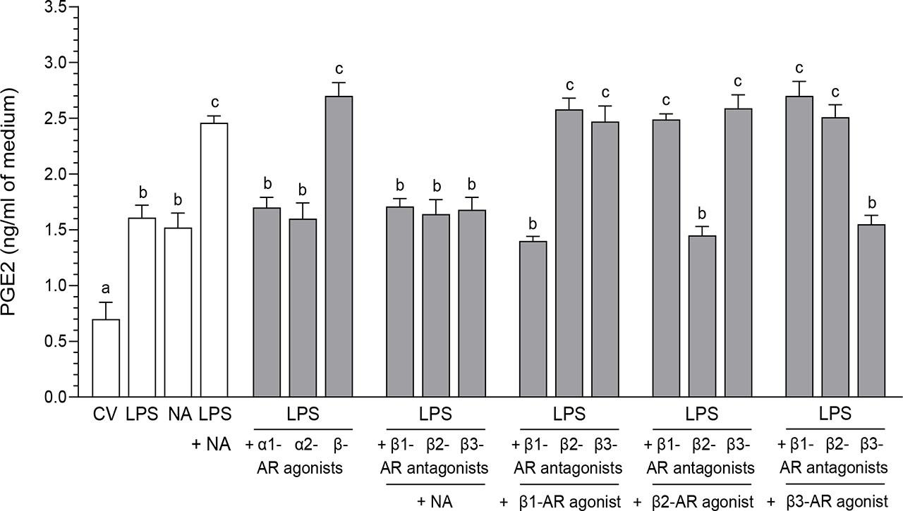 Influence of noradrenaline (NA, 10−5 M) alone or agonists of α1-, α2- and β-adrenoreceptors (ARs, 10−4 M) alone or antagonists of β-ARs (10−4 M) alone on the prostaglandin E2 (PGE2) content in the medium of pig cultured endometrial epithelial cells_