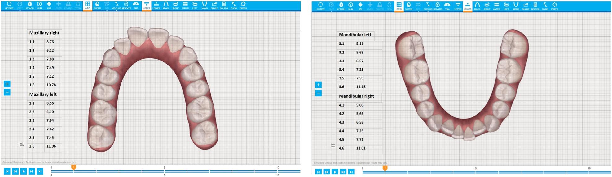 Invisalign technology displaying upper and lower arch with Mesiodistal dimensions of permanent teeth (300dpi).