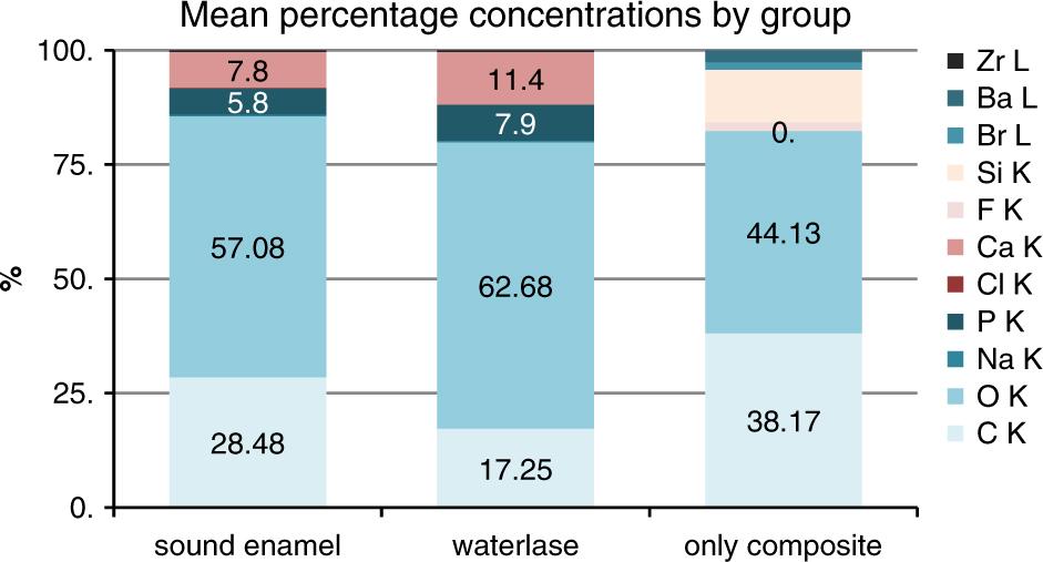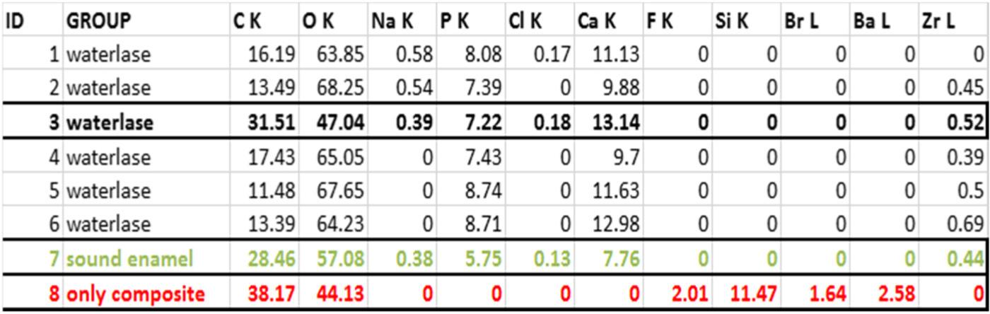The results of the present study showed significant differences in the experimental element composition, compared to the composite sample. The composition had a higher level of similarity against the sound enamel sample, whereas the composite sample showed no calcium nor phosphate but relatively high concentrations of silicon, barium and bromine. In contrast, the WaterLase Biolase® and sound enamel samples were composed of the same elements with moderate concentration differences of calcium and phosphate. The closest atomic structure was shown by experimental sample n3, with values very similar to those of sound enamel, n7. Ideally, the other experimental samples, n1,2,4,5 and 6 provided equally similar values. The concentration levels of these elements can vary dependent of the area of the tooth. The WL samples had an absence of the signature composite elements such as silicon and barium. Therefore, it may be concluded that the WaterLase Biolase® technique achieved almost complete ablation of the composite and removed the remaining composite within the enamel tubules.