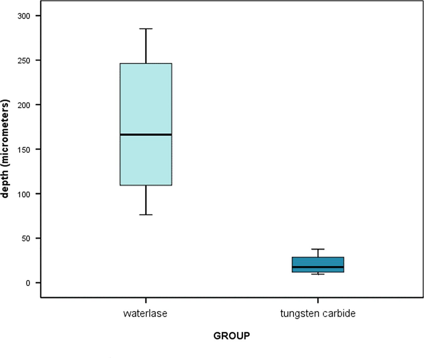 Comparison of depth of removal between groups: medians and 95% confidence intervals in ten WaterLase Biolase® and ten tungsten carbide samples.