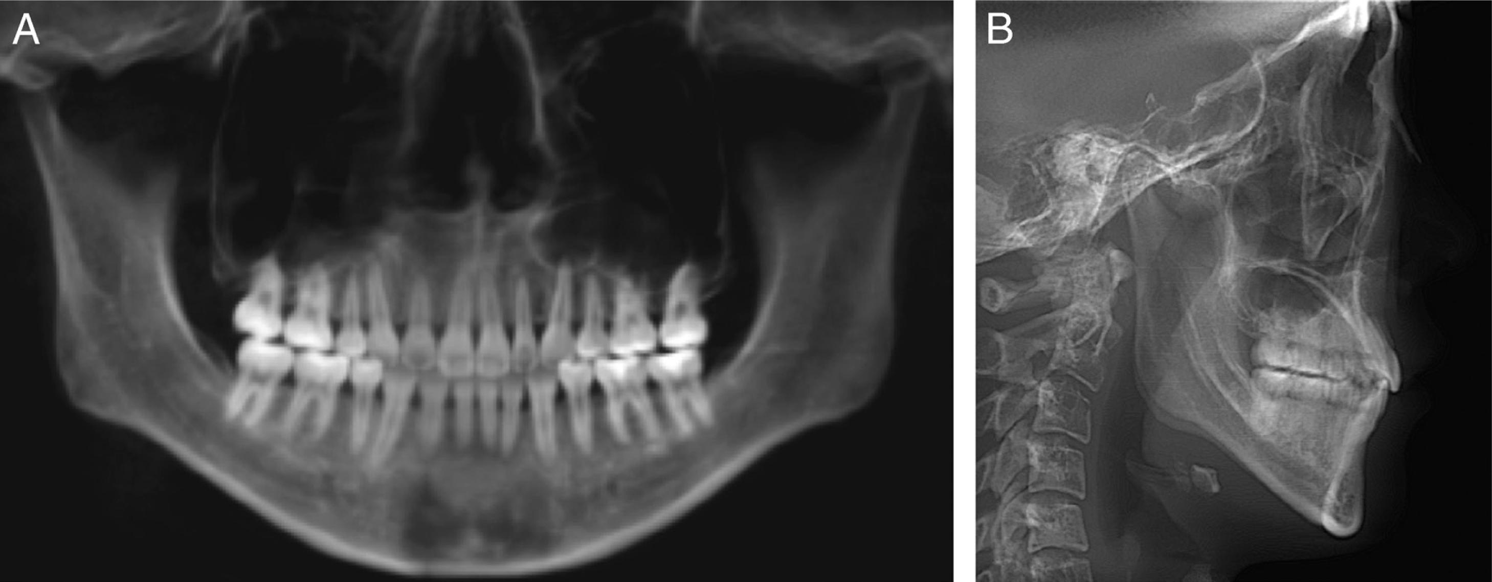 Pre-treatment panoramic radiograph (A) and lateral cephalometric radiograph (B).