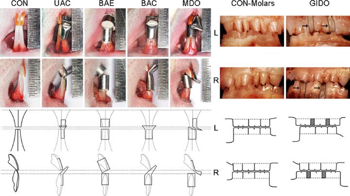 Representative frontal and lateral views, and a sketch map of the incisors’ occlusal relationship in experimental group rats. BAE, bilateral anterior elevation; BAC, bilateral anterior crossbite; CON, blank control; GIDO, gradually induced disordered occlusion; MDO, mandibular deviated occlusion.