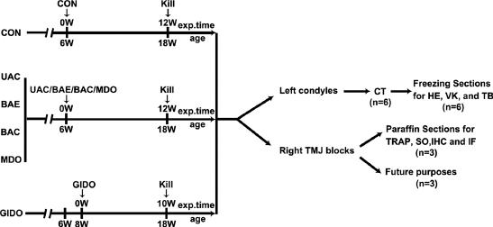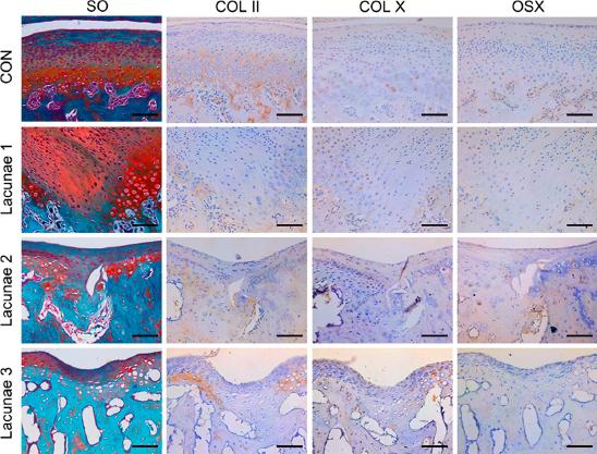 Representative histochemistry, immune-histochemistry (IHC) staining of the condylar lacuna induced by occlusal disturbance. Lacunae were detected by SO staining and IHC staining for Col-II, Col-X, OSX. For SO and IHC staining, bars = 100 μm.