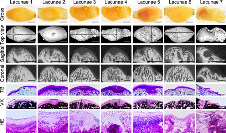 Morphology of the lacunae revealed by gross observation, micro-CT images, and toluidine blue (TB) and von Kossa (VK) staining. For Gross morphology, micro-CT images, TB and VK staining images, bars = 500 μm; for HE staining images, bars = 100 μm.