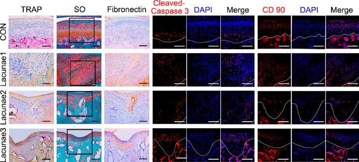 Representative sections with condylar lacunae induced by occlusal disturbance, stained with Tartrate-resistant acid phosphatase (TRAP) and Safranin O (SO), immune-histochemistry (IHC) for FN and immunofluorescence (IF) for cleaved caspase-3 (CCP3) and CD90. The black frames in the SO staining images showed the selected lacunae regions for IF staining. For SO, TRAP and IHC staining, bars = 100 μm. For IF staining, bars = 100 μm.