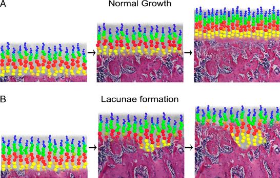 The diagrammatic sketch for normal growth of the condyle (A) and lacunae formation (B).