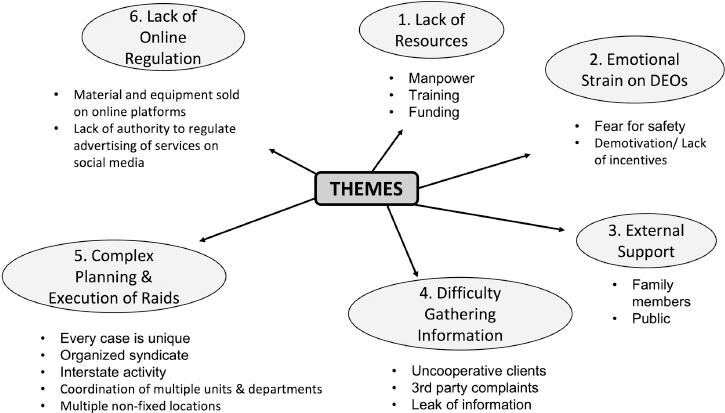 Data analysis revealed six predominant themes associated with the challenges of managing complaints against fake braces providers in Malaysia which were: (1) A lack of resources; (2) Emotional strain on DEOs; (3) External support for illegal providers; (4) Difficulty in gathering information; (5) Complex planning and execution of raids; and (6) A lack of online regulation (Figure 1).