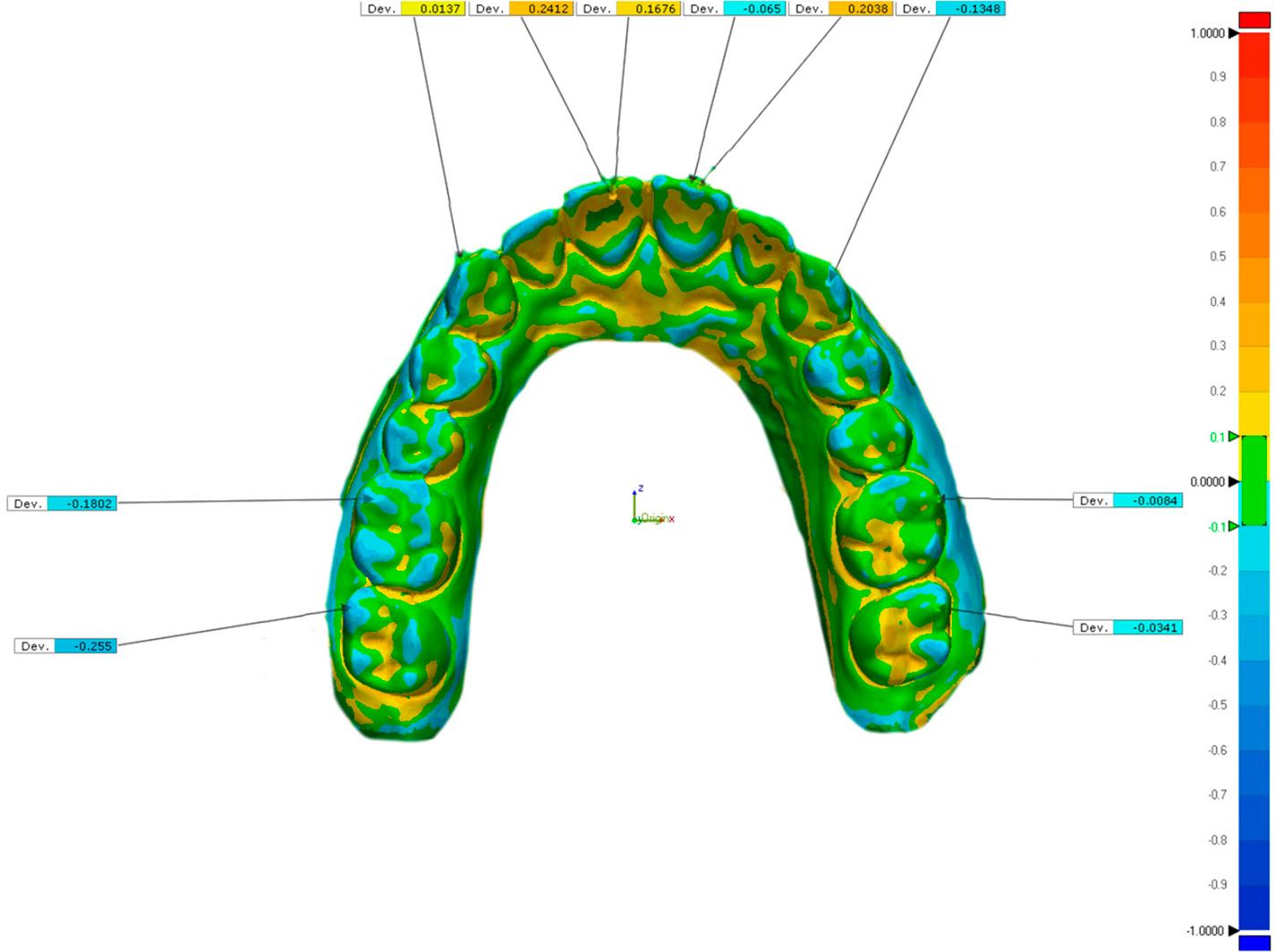 The need to assess the dimensional accuracy of aligners arises from a discrepancy of fit that could be a potential cause for the lack of movement in planned orthodontic movement.14,15 Depending on the deviation’s location, undesired tooth movement or other clinical concerns can arise due to an imprecise aligner fit which could jeopardise the expected treatment outcome. The failure of teeth to follow a planned movement pathway is a common complication in clear aligner therapy.16