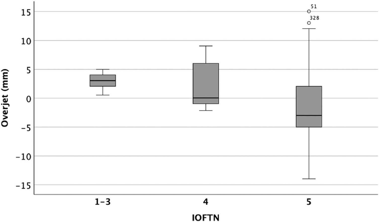 Box plots of overjet values (mm) in the 3 categories of IOFTN [5 (n = 214), 4 (n = 164), and 1–3 (n = 25)] showing a near normal range of overjet in IOFTN 1–3 category.