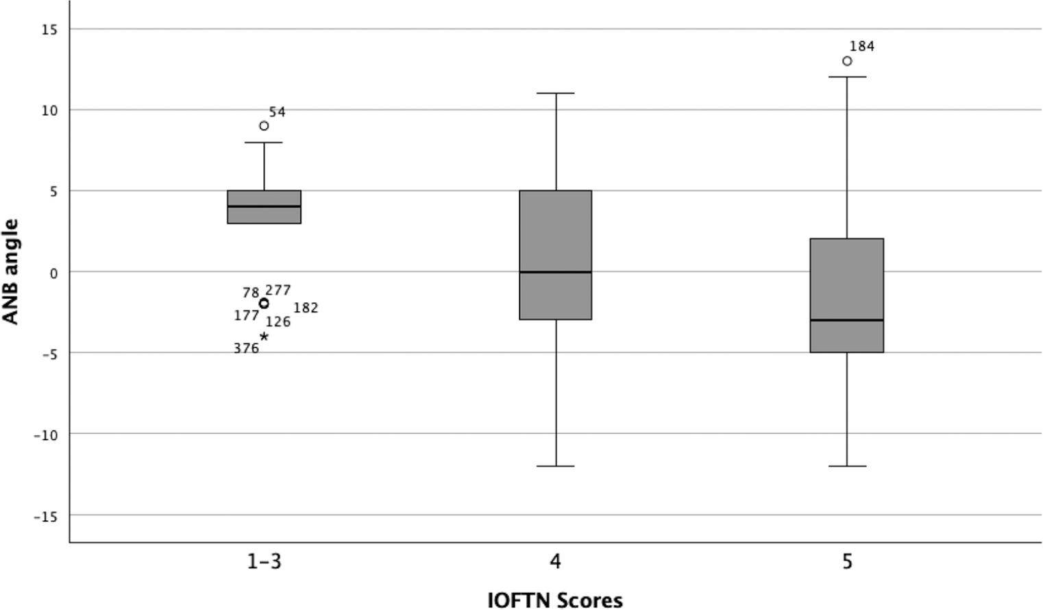 Box plots of ANB angles in the 3 categories of IOFTN [5 (n = 214), 4 (n = 164), and 1–3 (n = 25)] demonstrating a wide range of ANB angles in the IOFTN 1–3 category [mean (SD) = 3.44° (3.86°), 95% CI, 1.85°-5.04°, range = -4° to 9°].