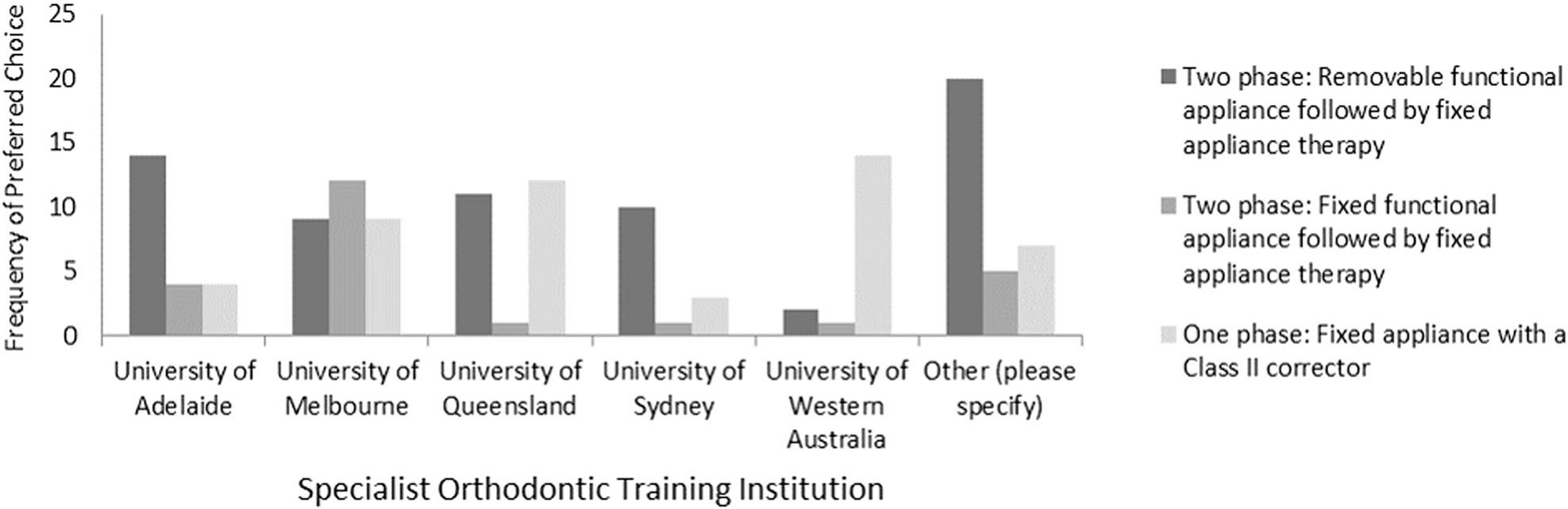 There was no statistically significant correlation found between the number of years an orthodontist had been practising as a specialist, or their principal place of practice (private clinic, government clinic or tertiary/university dental facility) and their preferred choice of Class II treatment. However, there was a strong, statistically significant relationship between the institution from which an orthodontist obtained their speciality qualification and their preferred choice of Class II treatment (Figure 1). Of the Australian trained orthodontists, graduates from the University of Melbourne and from the University of Western Australia represented those whose greatest use was the Herbst appliance (n = 18; 33.3% and n = 8; 14.8%, respectively) and the Forsus appliance (n = 20; 26.7% and n = 16; 21.3%, respectively). Whilst graduates from the University of Queensland (n = 22; 23.9%) and from the University of Adelaide (n = 19; 20.7%) represented the greatest number of Twin Block appliance prescribers (Table V).