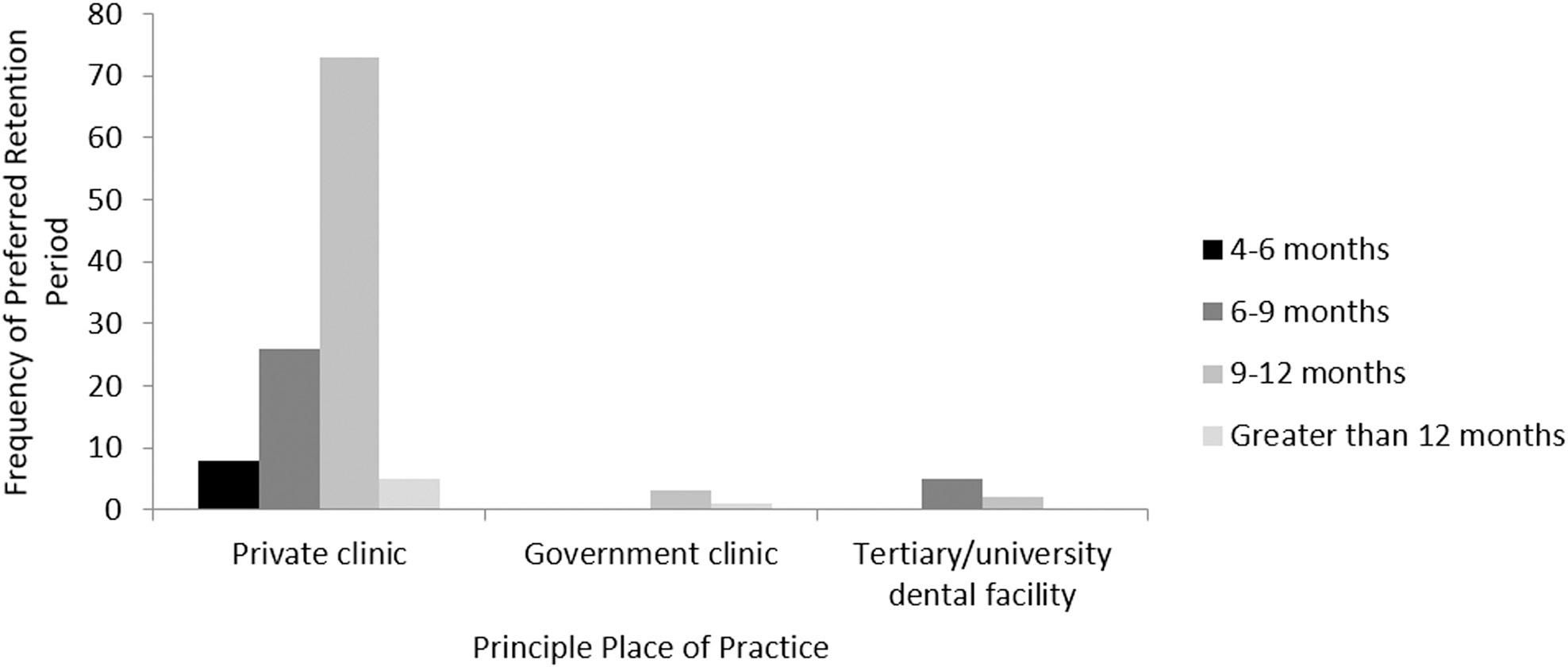 Eighty-one per cent of orthodontists (n = 100) typically began removable functional appliance treatment when a patient was between the ages of 10 and 12 years (late mixed dentition). The most typical removable functional appliance wear regime was full time, not including mealtimes (n = 79; 64.2%) with 9 to 12 months as the most common active functional appliance phase (n = 78; 63.4%) (Table VII). There was found to be a statistically significant relationship (P < 0.05) between an orthodontist’s preferred active removable functional appliance phase length and their principal place of practice (Figure 2).