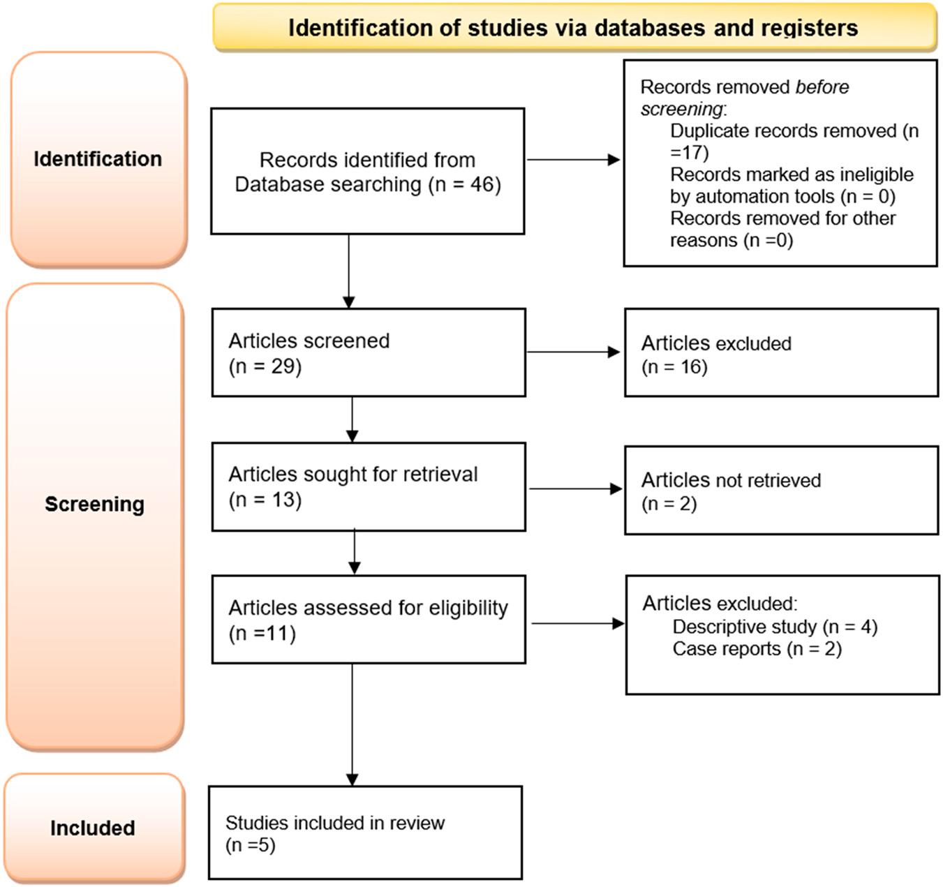 The electronic screening of PubMed and Google Scholar identified 46 articles. After adjusting for duplicates, 29 articles were assessed for inclusion in the present study. The majority were later excluded because of irrelevant titles or abstracts, leaving 11 articles. After excluding four descriptive studies and two case reports, 5 original articles remained for analysis. The PRISMA flowchart of the electronic database search is presented in Figure 1.