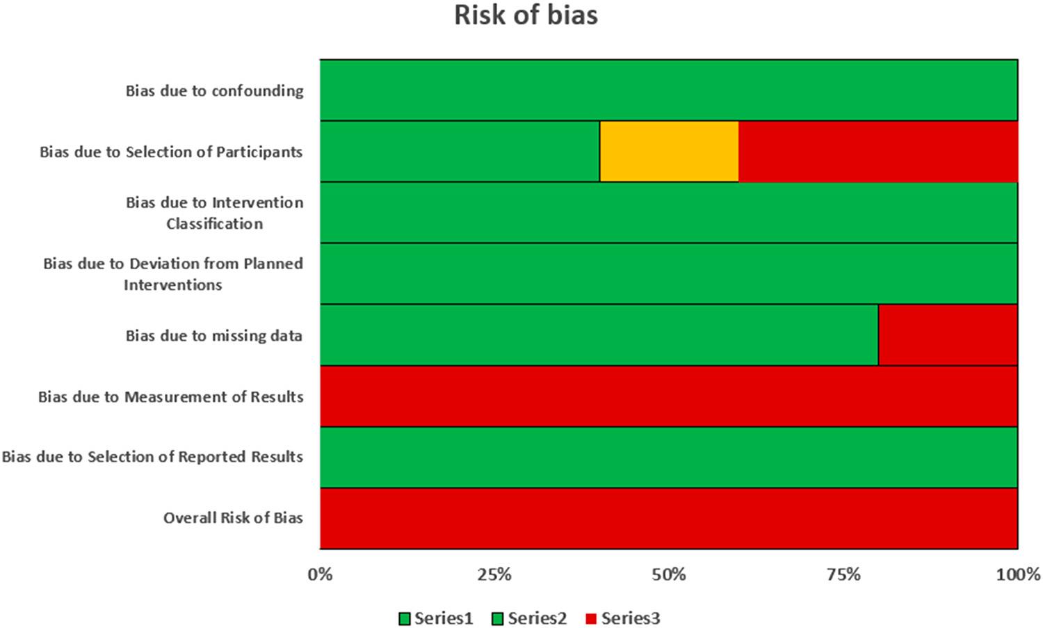 | Risk of bias of confounding | Risk of bias in the selection of participants | Risk of bias in the intervention classification | Risk of bias as a result of deviation from planned intervention | Risk of bias as a result of missing data | Risk of bias in the measurement of results | Risk of bias in the selection of reported results | General Judgment of Risk of Bias | |