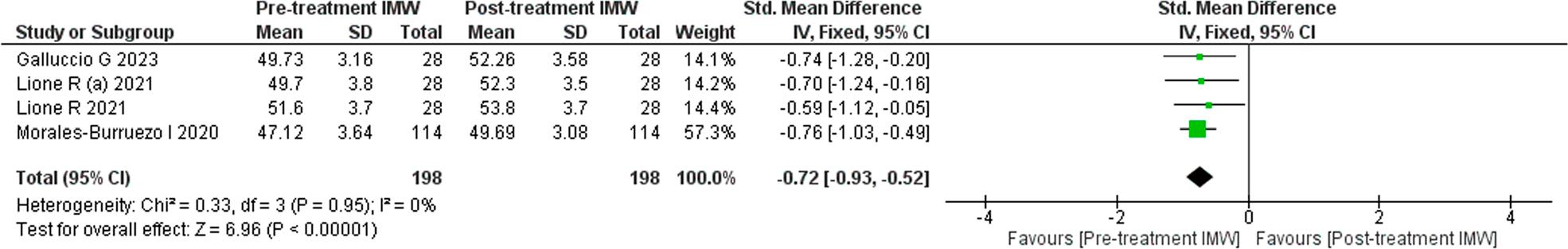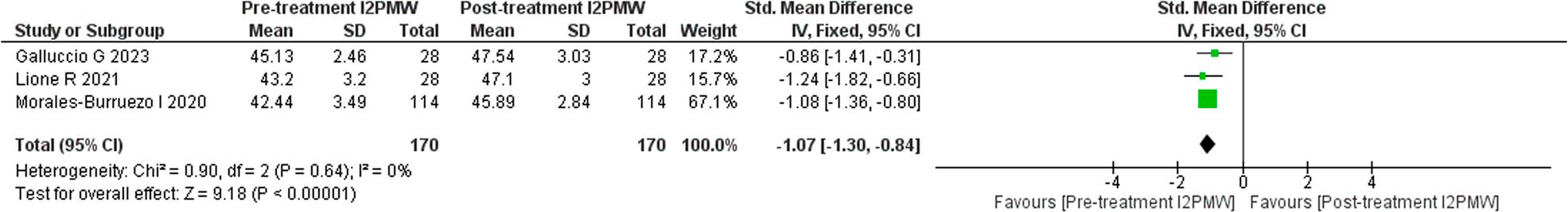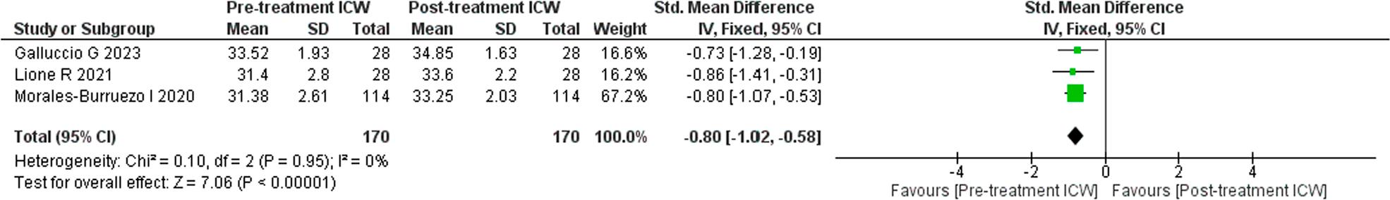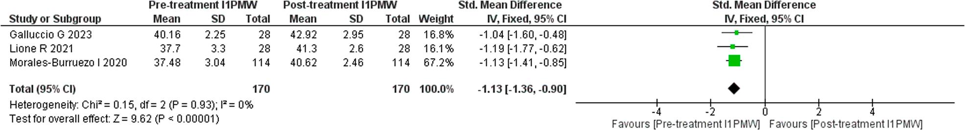 A meta-analysis was performed on three studies that qualified with the required dataset that could be quantitatively analysed and depicted as a forest plot. Heterogeneity was more than 50% (I2 = 0%) and so a fixed effect model was applied. The change in inter-first premolar width after the orthodontic treatment was greater than the inter-first premolar width before treatment (SMD: -1.13; 95% CI = -1.36 to -0.90; Z value = 9.62), and the difference was statistically significant (p < 0.00001).